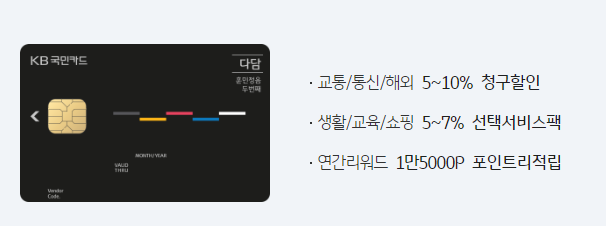 국민카드 다담카드를 이용하면 SK주유소에서 주유 하고 리터당 60원 청구할인 혜택을 받을 수 있습니다. 그리고 휴대폰 요금의 10%도 할인 받을 수 있고 롯데월드, 에버랜드, 캐리비안베이도 최대 50%까지 할인을 받을 수 있습니다. 자세한 혜택은 아래와 같습니다.