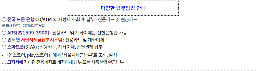 1) 온라인 납부 : 위택스(www.wetax.go.kr) , 인터넷 지로(www.giro.or.kr) , 각 지방자치단체 홈페이지